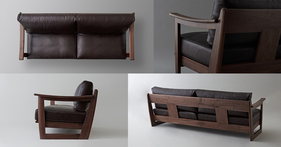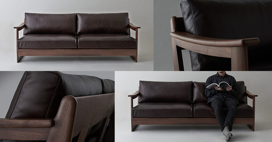 座面が1800ミリ長と2人ならとてもゆったり座れるソファーです。肌触りを表現する表皮は、数あるレザーメーカーの中から革の質感に加え、ウォールナット材にマッチする発色・耐久性などを厳選しました。